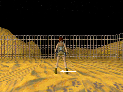 This bug works best in TR1, TR2 and TR3 and the bonus levels for these games. Here you take advantage of seams between two-dimensional textures (like fences or balconies) to force Lara through to the other side. The fence bug doesn't require as careful positioning as the corner bug, but I have described one possible technique below, since it is fairly accurate and fairly easy to follow. Once you've gotten the hang of it, you won't need to use such a precise setup.