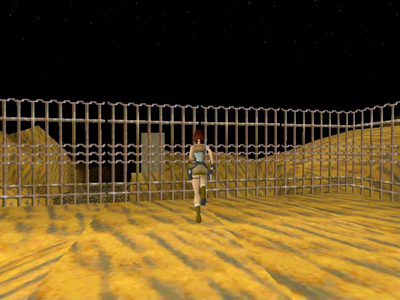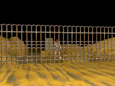 Run at the fence. If you've positioned Lara correctly before starting to run, she'll go right through the gap between the sections of fence. (screenshots 5 & 6)