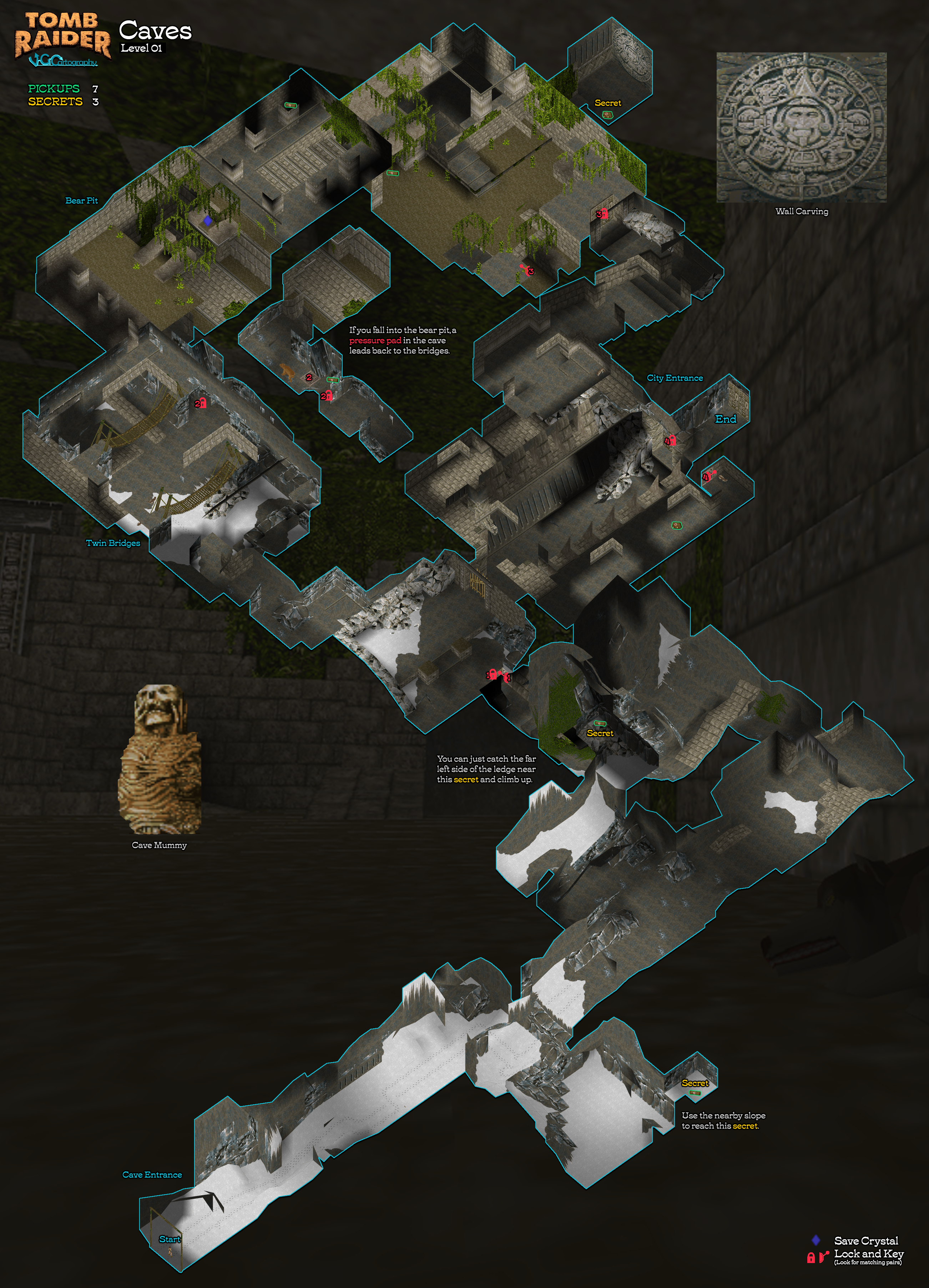 Tomb Raider I-III Remastered updates are in progress but will take time. For levels that have not yet been updated, I will continue to link to the ORIGINAL WALKTHROUGHS, which cover all the basics. Follow this link for the archived classic Caves walkthrough.