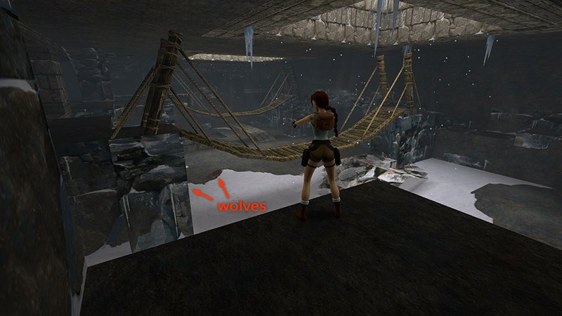 ROOM WITH WOODEN BRIDGES & WOLVES: Follow the passageway to a landing above a room with two wooden bridges. Two wolves (6-7) lurk below. They're asleep when you arrive but will rouse and begin to pace as you approach the edge. (screenshot) You can shoot them from the safety of the ledge and bridges, but first, check the achievement/trophy note below.
