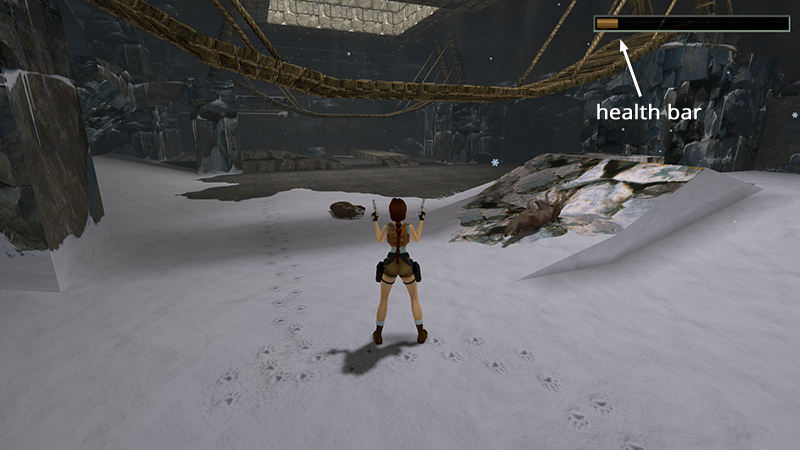 LEVEL ENTRANCE: Follow the paw prints in the snow straight ahead. Soon you'll reach an area with slits in the walls. This is a dart trap. Keep running and Lara should get past the darts with little or no damage.