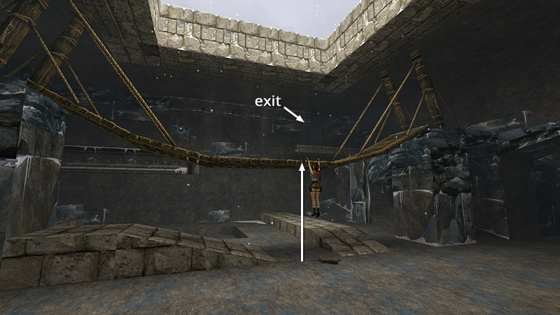 NOTE: You can't sidestep with modern controls, so just move Lara into the left corner below the ledge, face the opening above, and press Secondary (Shoot) + Forward to grab the edge and pull up.