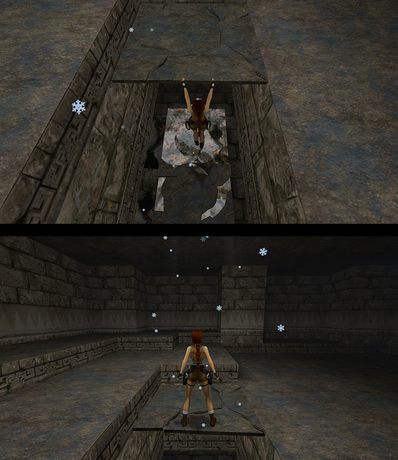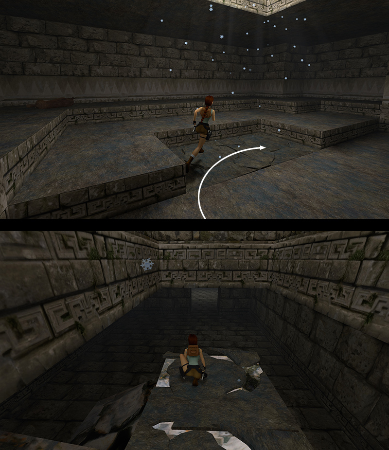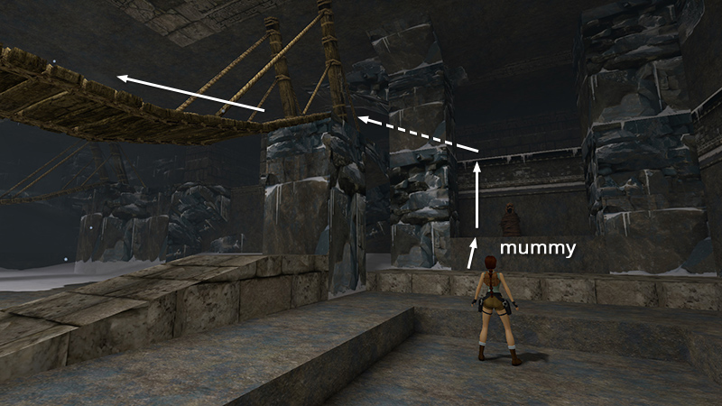 NOTE: If you're a new player, now is a good time to practice that jumping technique from the training level. Walk Lara to the edge. Release Walk then press Back/Down to take a single hop back. Hold Forward then almost immediately press and hold Jump, and Lara will run two steps then take off into the air on the third. She'll land safely on the other side. (screenshots and video) If you set up jumps this way, Lara will never run off the edge and almost never miss a landing. (This technique applies to the classic tank controls. If you're using modern controls, you'll need to judge the run-up yourself and practice until it feels natural.)