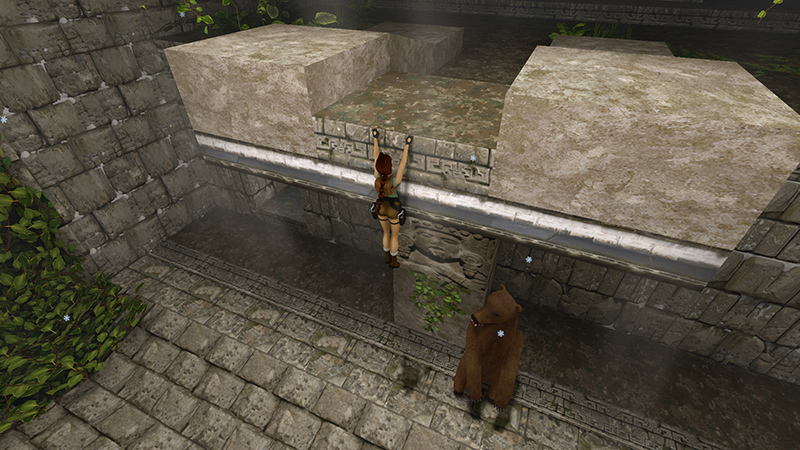NOTE: The "Circus of Vilcabamba" achievement/trophy requires you to "look at the bears standing on hind legs." There are 3 bears in all. This is the first one. It may rear up on its hind legs as you watch it from above, but if that doesn't happen, try dangling Lara from the ledge to tempt it. Hold walk as you turn around so Lara's back is toward the pit. Then release Walk, hold Action, and press Back/Down to drop back and grab the edge. As long as you hold Action, Lara won't let go. Press Left/Right to traverse from side to side, looking ever so tasty, or Forward/Up to pull up. As Lara dangles, the bear should hopefully be tempted to stand up. (screenshot) I've heard that the bear needs to be fairly close to Lara, and that you must press the Look button to actually "look" at it. If you're not sure whether it registered, check your achievement/trophy progress, which should track the number of bears in your current playthrough. Once you've seen it, pull up and shoot the bear from the safety of the ledge. I'll remind you again when we get to the bears in the next level.