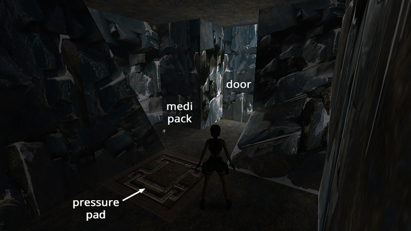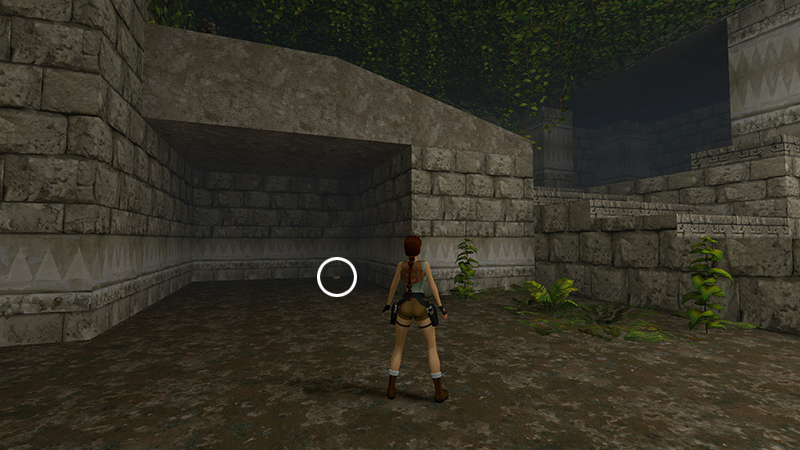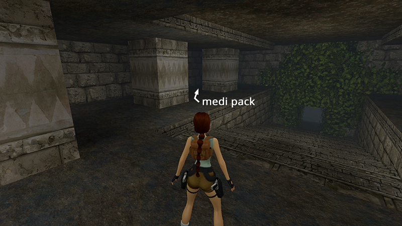 NOTES: The hand icon above the health pack is an action indicator, a new feature in the remastered games. (This was an exclamation mark before the first major patch, so you'll see that in a few of my screnshots.) These highlight collectibles, switches, and other objects Lara can pick up or manipulate using the Action button. You can enable/disable action indicators in the Options menu. Press Esc (keyboard), View (Xbox), touchpad (PlayStation), – (minus on Switch) to open your inventory. Then press Down to access the lower menu ring. Press Left/Right to select 'Controls,' then Action. In the Controls menu, uncheck Action Indicators if you don't want to see those icons. I personally find them very helpful, especially in later levels where small items, such as keys, can be hard to spot. Walk To Action can also be enabled/disabled here. If Walk to Action is enabled, you don't need to position Lara as precisely. As long as she's close enough, if you hold Action, she'll automatically maneuver into position to take/use an object. (screenshot)