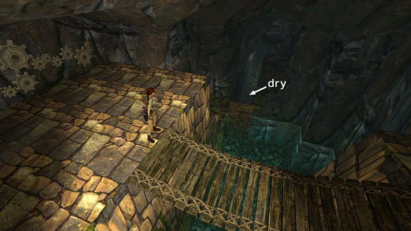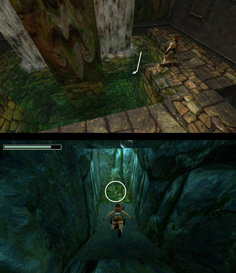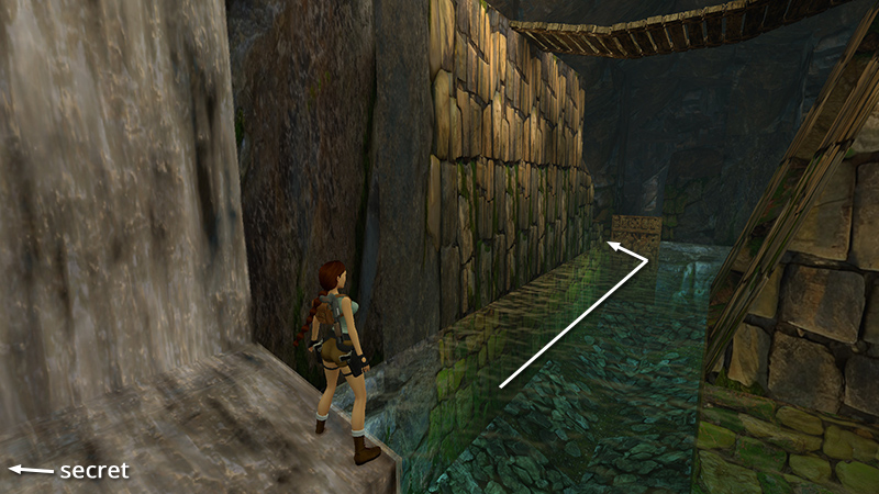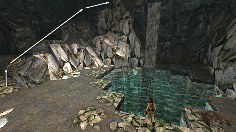 LEVEL EXIT: Climb out of the pool on a ledge that was previously hidden behind the waterfall. Follow the passageway to the end of the level.