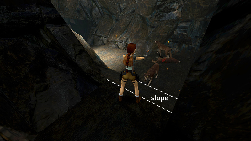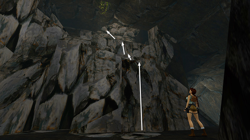 PASSAGE FROM CAVE WITH POOL TO VALLEY: Climb into the cave opening opposite the waterfall, where you'll encounter another wolf (3). When it's dead, continue through the twisty passage until you come to a wall with flat, stepped blocks and an opening high above. You'll climb up in a minute, but if you want all the kills, follow the tunnel to the right, where you'll encounter 3 more wolves (4-6). If you slide down the short slope into the cave with the wolves, step back once, then backflip, Lara should land on the ledge at the top of the slope. The wolves can't reach her there, so you can shoot them with pistols at your leisure. (screenshot) Now return to the raised opening and climb the flat blocks to reach it. (screenshot) At the top, pick up a large medi pack (3) left behind by another hapless traveler. Continue forward and climb down into a green valley.