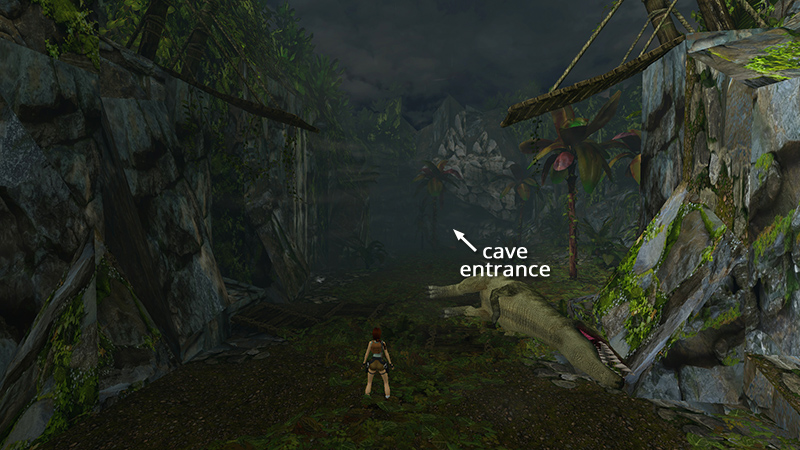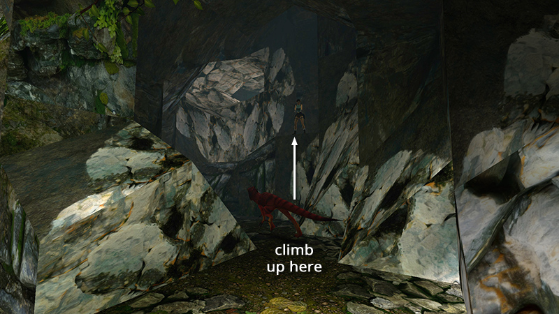 If you want to play it safe (or avoid killing the T. rex for the achievement), run into one of the caves along the right-hand (east) wall of the valley. Don't pick the first alcove; it's too shallow, and the T. rex can easily reach Lara. Instead, choose the ground-level opening just below the right side of the broken bridge. Follow this passageway forward then left. About halfway in you'll encounter another raptor (10). If you approach cautiously and get a pistol lock on it, you can back away while firing without being bitten. When it's dead, continue to a wide opening higher in the valley wall. Then just wait and blast the T. rex as it stomps by. If it wanders off, dangle Lara from the edge to get its attention or return to the first opening and try to shoot it from there. (screenshots)