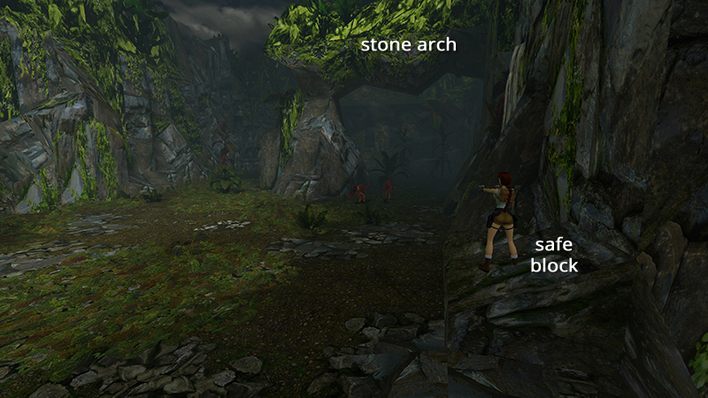 ROCK ARCHWAY AND SMALL BUILDING: Turn right (west), and approach the large stone arch and the building beyond. Two raptors (12-13) approach. There's plenty of room to maneuver, so back away while firing. If they make you nervous, climb onto the low block you used to reach the third secret. I don't think they can reach Lara here. (screenshot) Kill them and advance toward building.