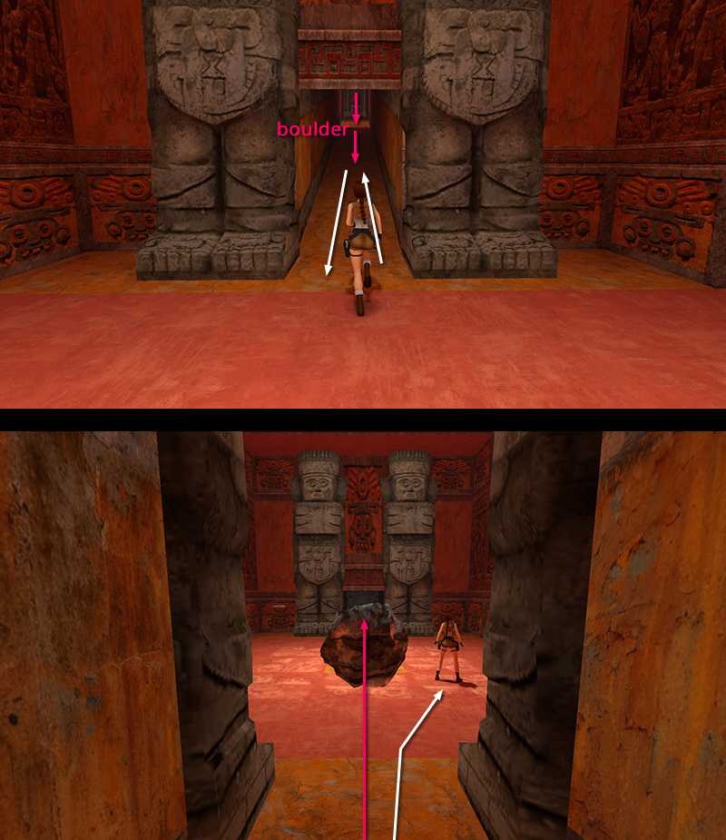 Cross the room and start up the sloping passageway straight ahead. After you've taken about 5 steps up the ramp, the gate at the top closes, and a boulder drops from the ceiling and rolls down the ramp. Quickly roll and run down the ramp. At the bottom, run to either side to avoid being flattened. (screenshots) The boulder will roll across the room and into the passageway where you entered. If you approach the gate at the top of the ramp, you can see into the room beyond, but you can't get inside yet.