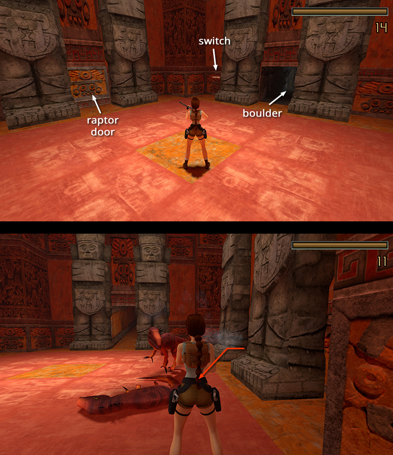 Return to the room at the bottom of the ramp. Find the switch on the wall to the left of the passageway where the boulder went. Pull it to open the nearby door, then immediately roll and draw weapons (I like the shotgun here) to dispatch the 2 velociraptors (1-2) that charge out. (screenshots)