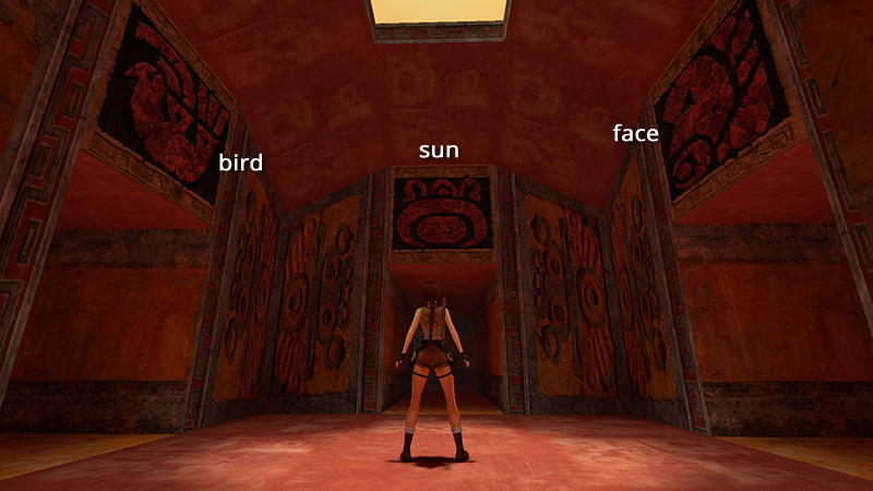 FOUR-WAY INTERSECTION: Follow the hallway the raptors came from to a FOUR-WAY INTERSECTION. (There's a save crystal here in New Game+.) Note the pictures over the doors: To the right a stylized face, ahead a sun, to the left a bird. (screenshot) Each door leads to one of the switches that raise the gates in the main area. You can explore these side areas in any order. Let's start with the right door (face).