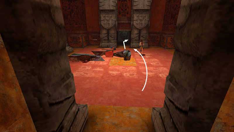 Take the FIRST PIECE OF THE SCION (5) and the ceiling begins to collapse. Head toward the gate on the east side of the room, which will open as you approach. Run down the ramp toward the large square room where you started. Keep running at a steady pace, or veer to the right to avoid the center of the room. The falling debris should then miss Lara. (screenshots) Continue straight on into the rocky tunnel. Move past the boulder and on to the pool. (NG+ players will find a save crystal in the passageway.)