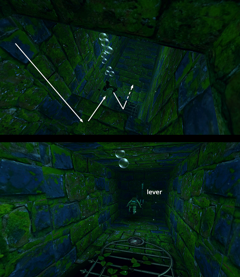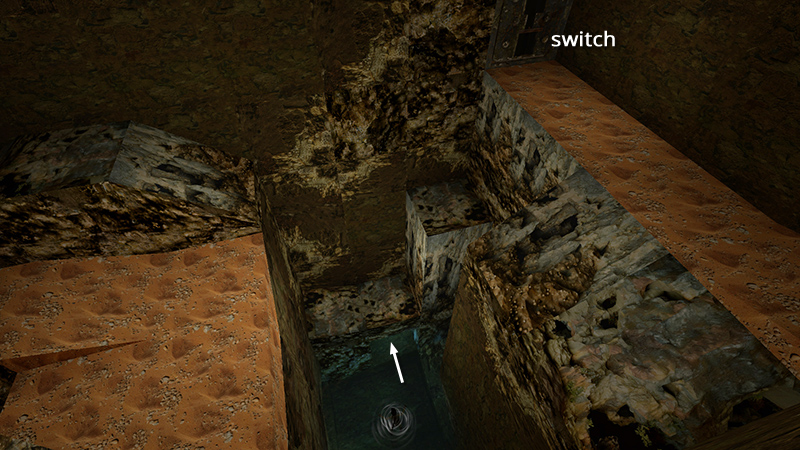 NOTE: The most common problem in this area is confusion between the T-shaped switch, which can only be used on dry land, and the broom-handle-shaped lever, which can only be used underwater. Some guides use "switch" and "lever" interchangeably. I find it helps to make this distinction. First you want the lever, in the lower passageway. Then, after the water is drained, you can use the switch.