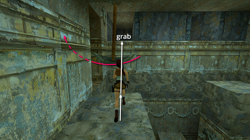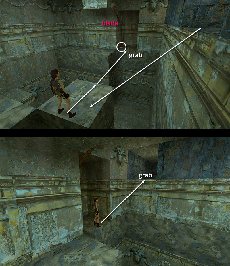 TALL ROOM WITH LEDGES AND SWINGING BLADE (AGAIN): Take a standing jump down onto the square block below the doorway. Turn right and take a running jump across the gap to grab the edge of the alcove with the shotgun shells (7). Pull up and get the ammo. Whether or not you've already triggered the swinging blade on the left side of the alcove, it shouldn't be a problem. Position Lara in the middle of the alcove with her right foot at the edge. Adjust her angle so the elevated doorway is directly ahead and there's room to clear the corner of the alcove. Then take a standing jump to grab the doorsill and pull up. (screenshots) Alternatively, if this jump is proving difficult, you can jump over to the longer ledge along the west wall. Position Lara on the seam between the two tiles nearest the swinging blade. Then, as the blade starts to swing to the left, take a running jump past it to grab the doorsill. (screenshots)