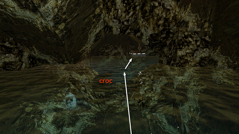 SUBTERRANEAN LAKE: There's a crocodile (14) in the water, so swim forward through the rock archway without hesitating. On the far side of the lake is a square gray ledge where you can climb out. (screenshot) Avoid the rocks on the right side of the archway. Lara can get stuck here, requiring you to reload. (screenshot) Kill the croc from the gray ledge. Then turn around and enter the passageway. Climb the rocks until you reach a gap high above the lake. On the far side you'll see a switch. Take a running jump across the gap to the square corner ledge below the switch. Climb up and use the switch to open an underwater gate elsewhere. (screenshots)