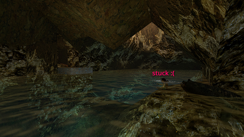 Drop into the water. Face the small, flat ledge at water-level (to the south). Swim down through the opening just below that ledge. (screenshot) Follow the flooded tunnel through several twists and turns to emerge on the southwest side of the lake.