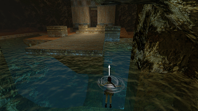 TIHOCAN'S TOMB: Surface and face the entrance to the tomb, which is flanked by two centaur statues. Before climbing out of the water, locate the switch that opens the tomb entrance. It's at the end of a well-concealed underwater passage beneath the right side of the building. Tread water near the right corner of the long ledge in front of the tomb. Swim down and forward toward the far (west) cavern wall. Look for a pointy, light-colored rock overhanging the opening. Swim underneath it and to the left, into a rough tunnel. Follow this tunnel upward, then right, into a section lined with manmade stone blocks. Swim through the gate you opened earlier and surface in a small room with a switch. Use it to open the tomb entrance and prime the centaur statues to animate when Lara approaches. (There's a save crystal in this small room in NG+.) (screenshots)