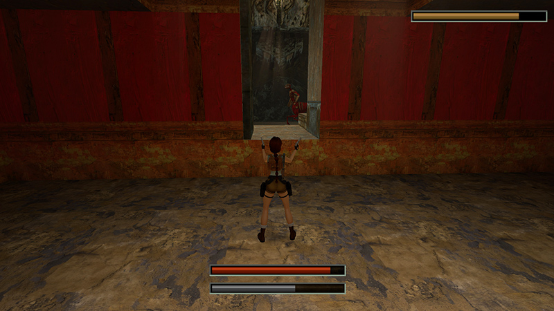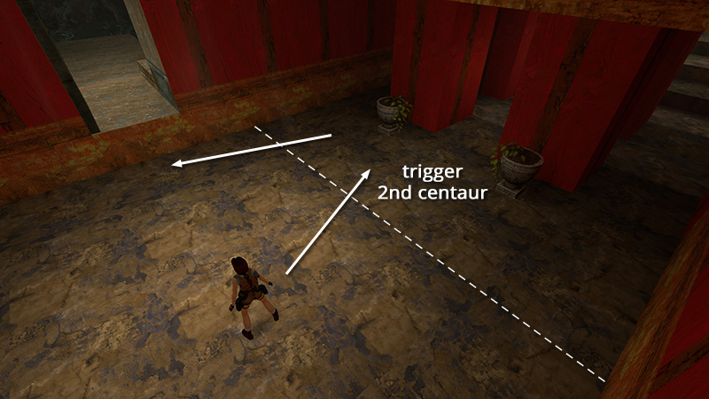 If you move to the right side of the room (i.e., close to the red pillars and potted plants, as shown in this screenshot) while fighting the first centaur, then return to the doorway, the second centaur will animate. So you'll have two running around out there. You'll see two boss health bars. If one bar is red and the other is gray, this means Lara currently has a weapon lock on the one with the red bar (screenshot). If you'd rather fight them one at a time, avoid the right side of the room until you've killed one centaur, then trigger the other. Also, if you go past the red pillars into the larger room, you'll trigger Pierre, then return to the doorway to finish off the centaurs.
