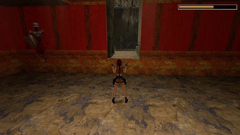 NOTE: If you don't care about getting all kills, pickups, and secrets, you can avoid the doorway on the right altogether. You'll miss an encounter with Pierre, as well as 3 crocodiles, 5 items, and secret #1. Skip down to the TALL ROOM WITH LEDGES AND SWINGING BLADE (AGAIN), below.