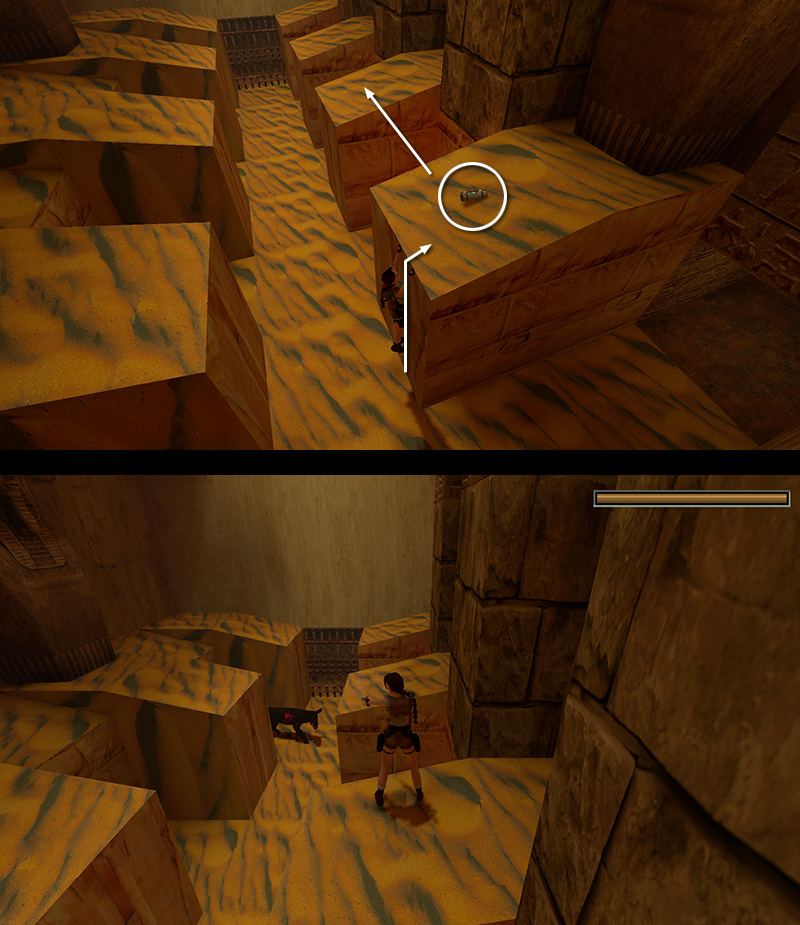 Now head for the northwest corner of the sandy area, beyond the CAT TEMPLE and to the right of where the boulder landed. Climb up as far as you can then take a standing jump up the sandy slope to land just to the right of the square pillar in the corner. Hop down into the dark depression to the right of the pillar. This is SECRET #1, a large medi pack and magnum clips (12-13). (screenshots)