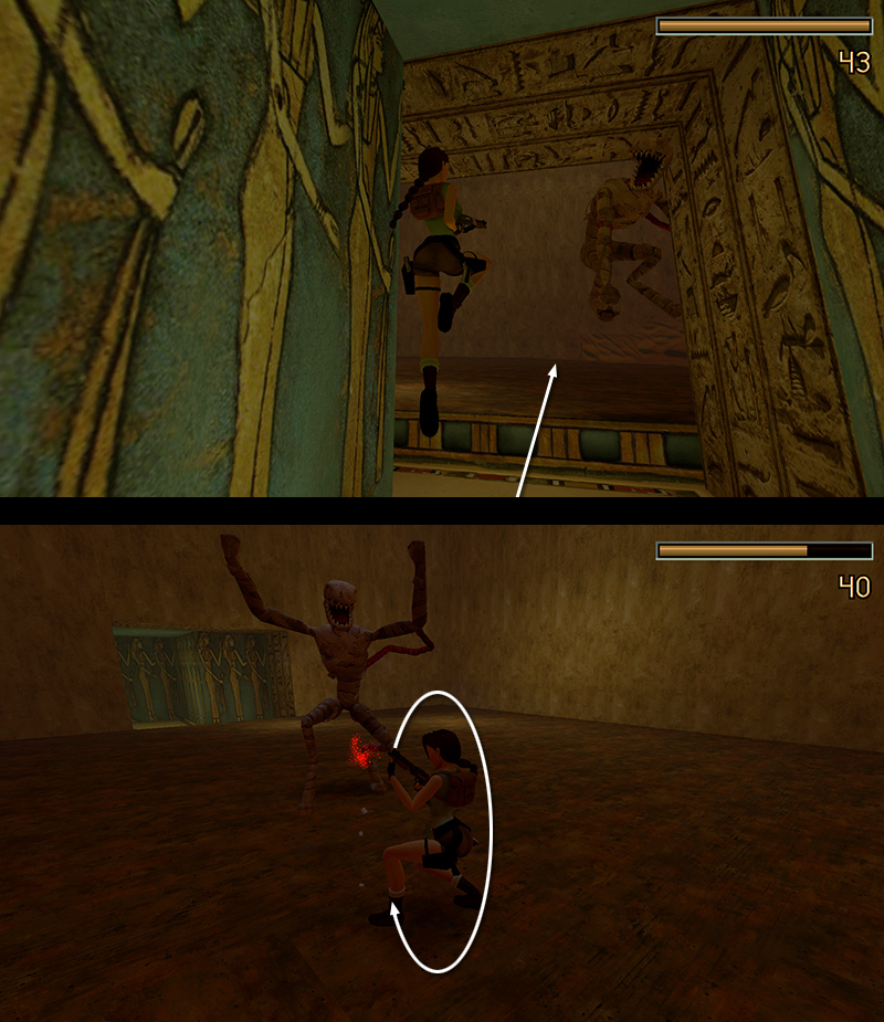 NOTE: Alternatively, if you feel compelled to prove your womanhood, after pushing the block out of the doorway, draw weapons and run/jump past the mummy into the room, firing as soon as Lara gets a lock on it. Roll and shoot, jumping/flipping out of the way if necessary, so it doesn't pin Lara against the wall. (screenshots)