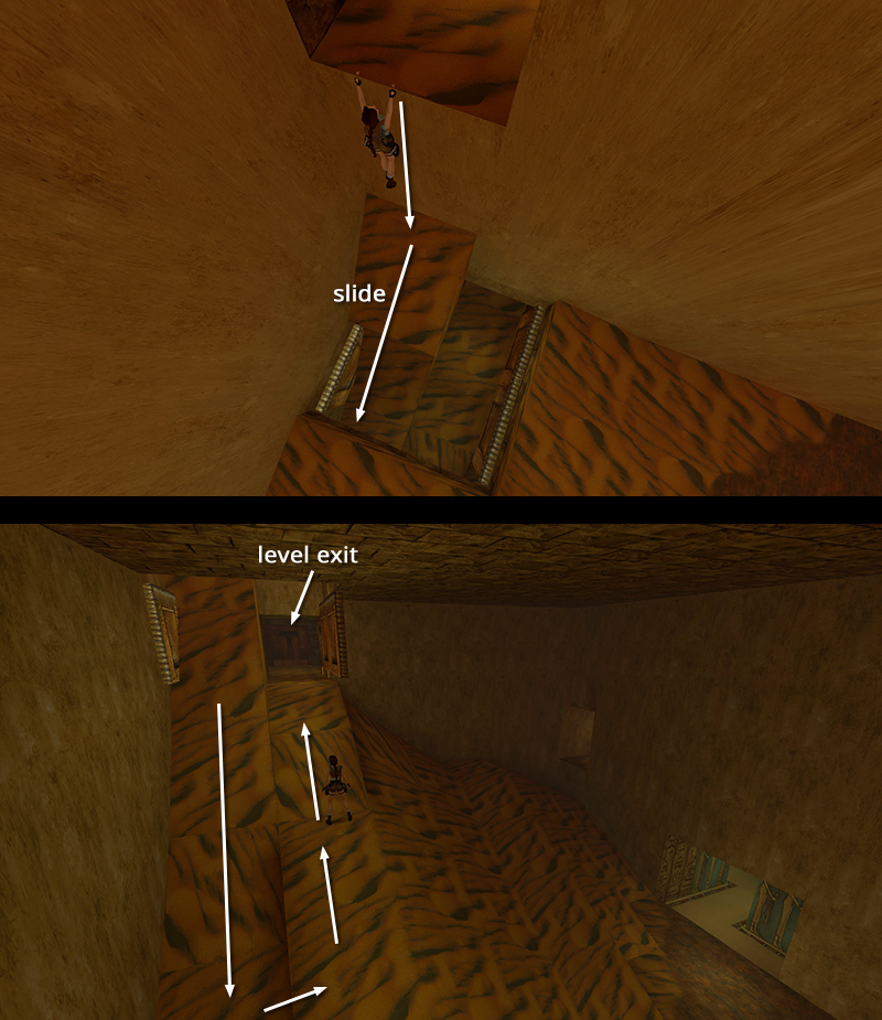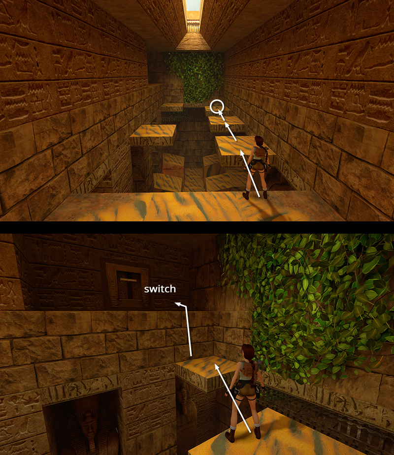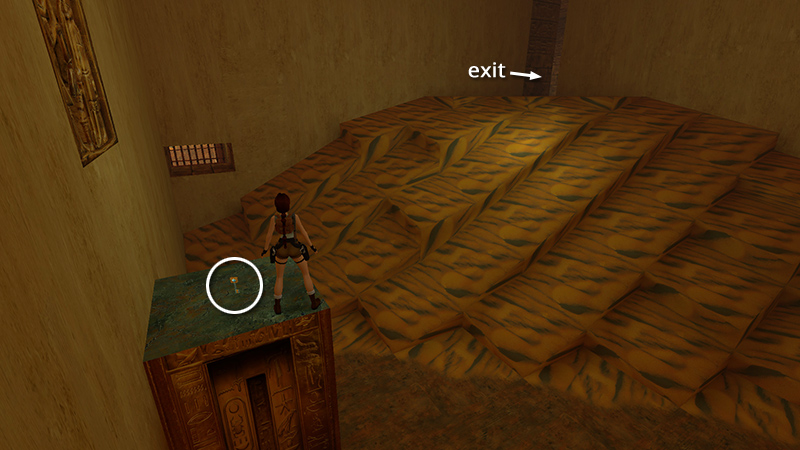 NOTE: If you fall off the ledges into the room below, either reload or use the corner bug to get back up to the ledge with the switch, in order to avoid the long trek back to this point. The page describing the shortcut at the beginning of the level shows how.