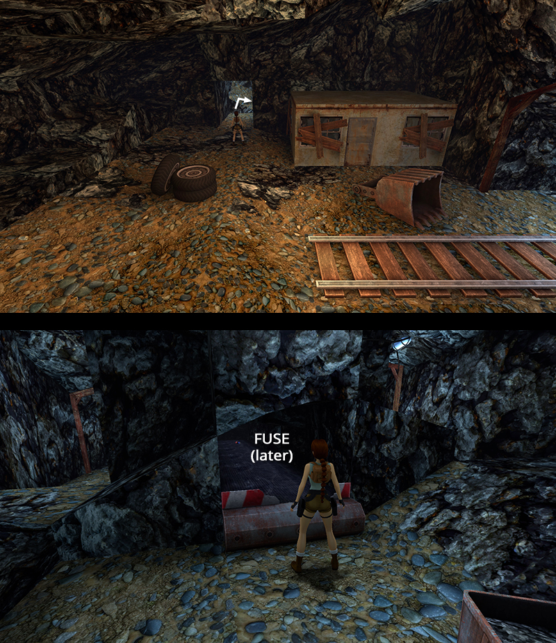 SOUTHEAST LANDING WITH BARRELS & BOXES (AGAIN) - SECOND FUSE: Return to the POOL, swim to the left (south), and climb out on the ledge with the barrels. Follow the passage to the drill car, which you just moved so it's no longer blocking the tunnel. Go into the tunnel and push the Natla box twice. Go around it and continue forward. Where the passage widens, move forward carefully and pick up the SECOND FUSE (5), which is lying on the ground. Don't go any farther or you'll attract the attention of the cowboy lurking ahead on the right. (screenshots)