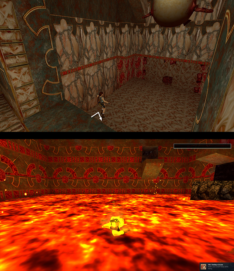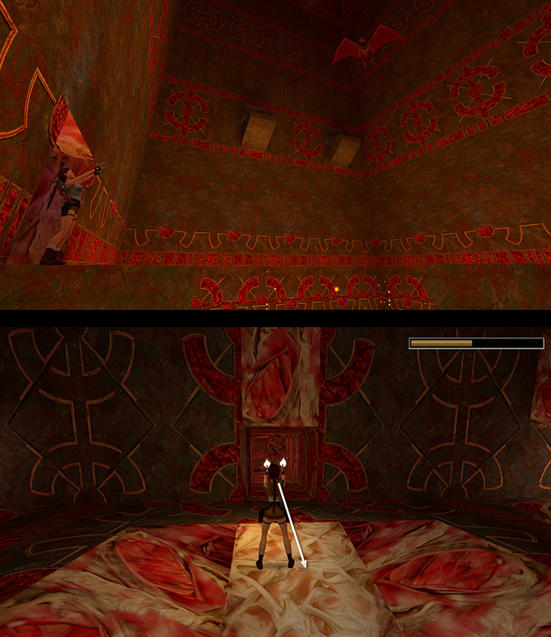 Pull the switch to open the trapdoor, revealing a lava pit below. You now have about 40 seconds before the trapdoor closes. So you don't need to rush, but don't dawdle either. Roll and run past the exit door toward the edge of the platform. Veer to the left a bit and take a running jump off the edge to land on (or grab) the angled, tan block against the left wall. (You can probably take the time to set up this jump, or just jump straight forward to land on the ramp below the angled block, turn left, and climb up.) Step forward, turn a bit to the right, and take a standing jump onto the taller tan block. The camera shifts to emphasize the svelte beauty of Bacon Lara. Press look to get Lara's perspective back. Then take a running jump along the corner of the pillar to land on the jutting left edge of the platform ahead. (Or take a running jump to grab the right edge and pull up.) Run to the middle of the platform. The doppelgänger should then run to the middle on her side and fall into the lava pit. (screenshots)