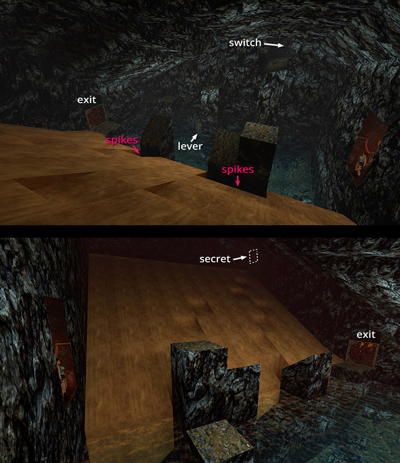 POOL BELOW EXPOSED PYRAMID: Continue to a room with a pool of water. On the left is a part of the sloping outer wall of the pyramid. Like the visible part of the pyramid at the end of the last level, there are several flat spots. There are also 2 spike pits at the bottom of the slope. On the right side of the pool are some rocks and pillars, which are too high to reach from the water, and a small room containing a switch. The exit is that red fleshy door on the far side of the pool. The lever that opens that door is underwater on the right. There's also a secret room at the top left (northeast) corner of the slope. (screenshots)