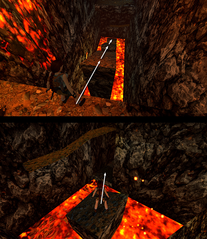 For now, take a standing jump to the first flat spot on the right (south) side of the lava stream. Take another standing jump to the next flat spot on the same side. Now take a running jump to the next. (If you're playing with tank controls, be sure to set up this jump by walking forward to the little "lip" where the next floor tile juts upward. Then hop back once and attempt to take one walking step backward. This will give Lara enough run-up for the jump. Otherwise, she'll stub her toe on that jutting floor tile and do a standing jump instead, land on the slope, and slide into the lava.) Alternatively, take a standing jump across the lava stream to the next flat tile on the other side, then take a running jump back to the next flat spot on the south side. Note that Lara will take some damage from the bubbling lava. (screenshots)