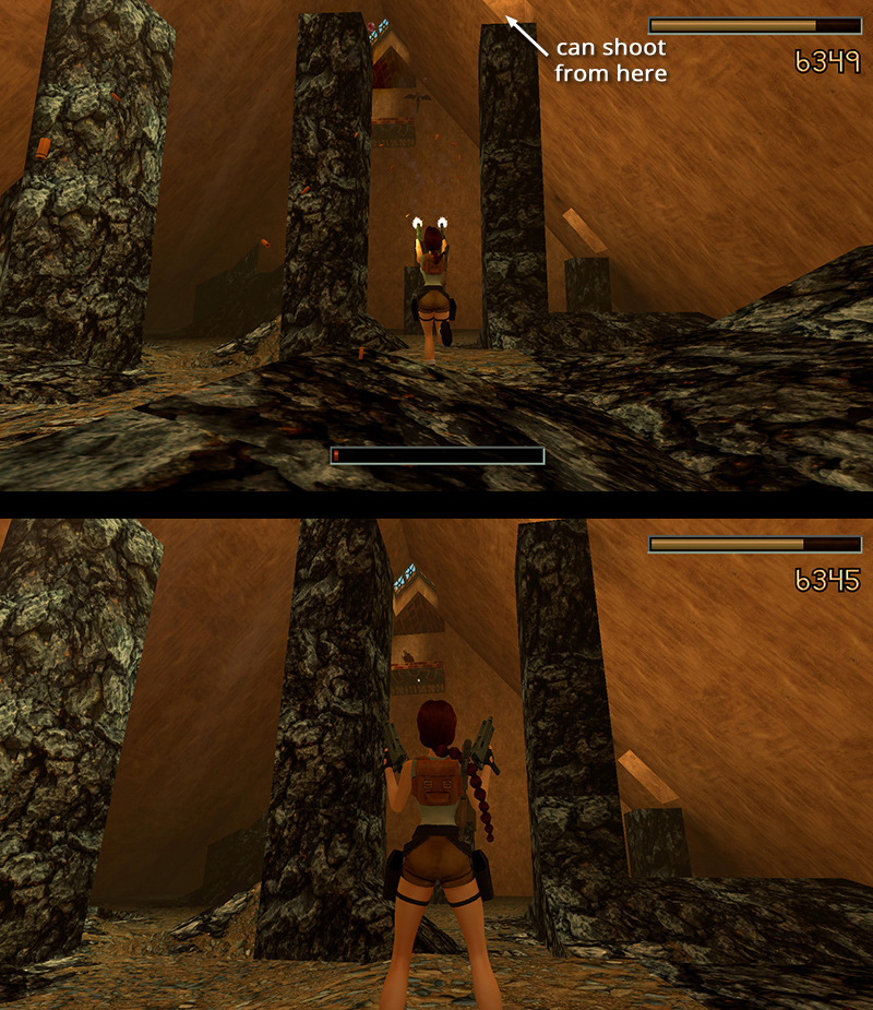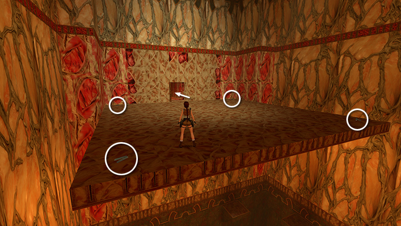 NOTES: It's possible for winged Natla to "die" on the high golden ledge on the east side of the room. If this happens, she'll revive there. Without wings, she won't be able to get down, making it more difficult to target her. (screenshot) You can climb up to the tall pillar at the end of the tunnel on the south wall, as described below, and shoot her from there. (screenshot) But Lara is a sitting duck on the pillar. If you're playing NG+, or have run out of health packs, you're better off just reloading and trying again. If you're struggling with Natla, especially in New Game+, check out this useful exploit from B0orisTheSpider.