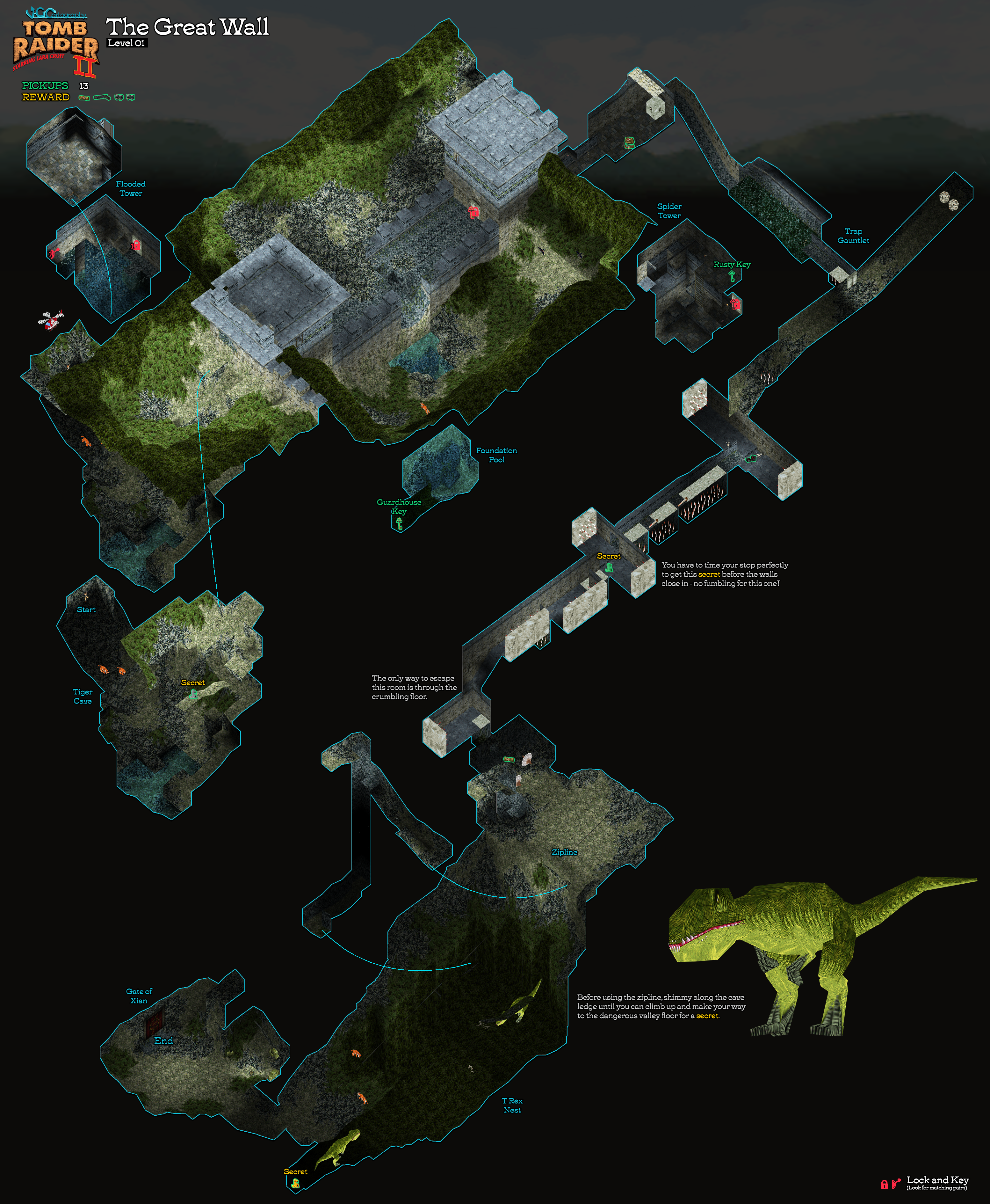 OBJECTIVES: Climb onto the wall and find a way into the guardhouse. Survive a gauntlet of traps in order to reach the cavern beneath the wall. Then make your way across this cavern to the exit. Note that there are a few secrets here that lie off the main path.