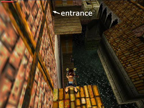 Once again, jump across the hole in the floor to grab the ladder and climb to the level above. Take a running jump back across the canal to the white ledge. From there, jump back to the wooden ledge near the entrance. (screenshot)