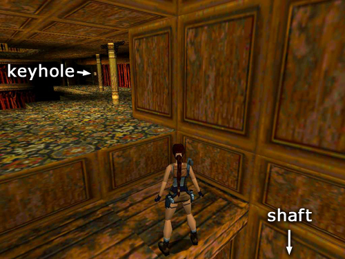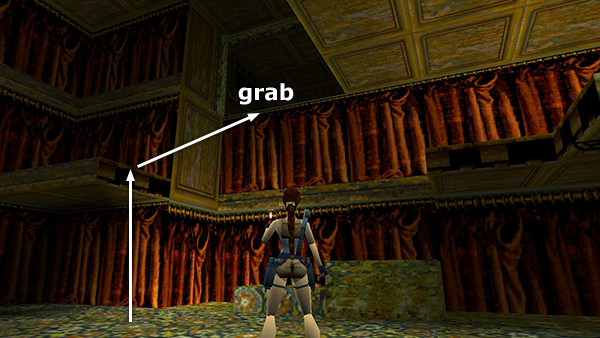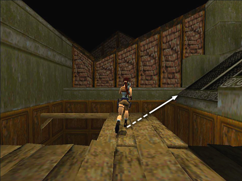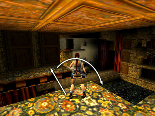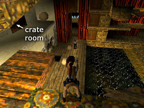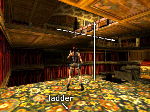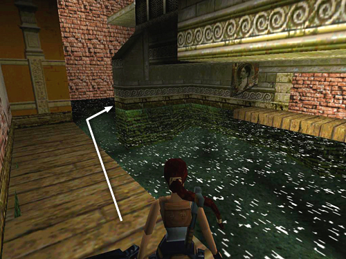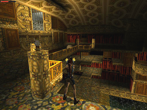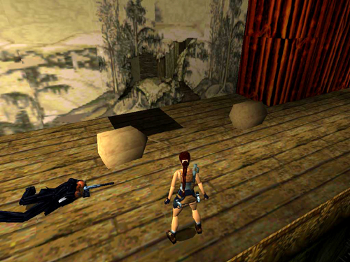 THE STAGE: Turn left and hop across the gap in the floor where you climbed up earlier. Jump from that ledge into the flooded orchestra pit below. (screenshot) If you jump directly into the pool from the corner where Lara is standing in the picture, she'll land in the shallow water and die.