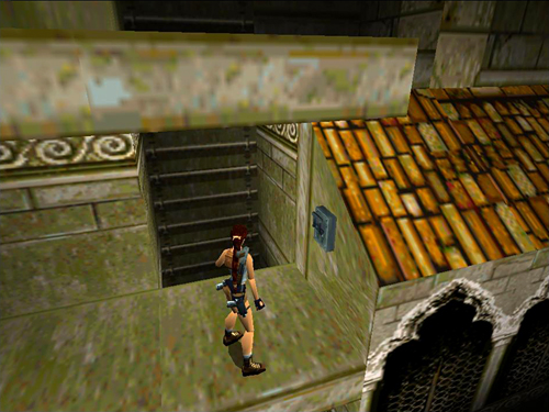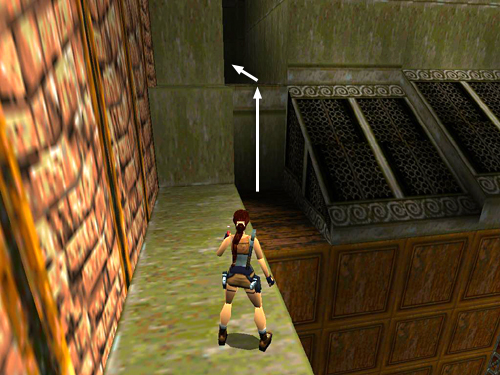 Turn around and take a running jump back to the platform with the broken glass. Be careful not to run on into the glass when you land. Turn left and cross the bridge you just lowered. Take a running jump and grab the wooden platform in the far left corner of the room. Pull up. Climb into the alcove above. Shoot the rat (32) on the high platform across the room. Then take another running jump to grab the edge of that platform. Pull up and go to the right.