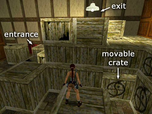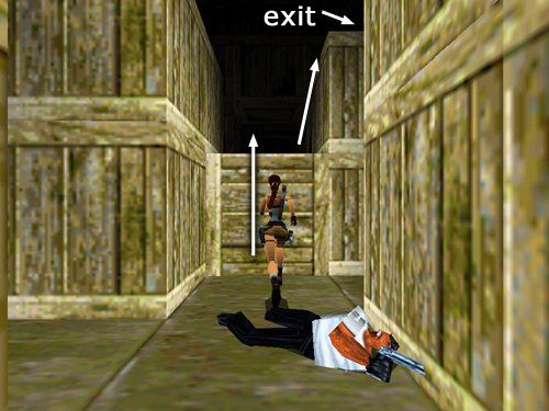 When the coast is clear, make your way across the tops of the crates: First, turn so the entrance is on Lara's left. Then take a standing jump to the next stack of crates in the middle of the room. In order to jump onto the L-shaped stack of crates ahead without getting hit by the swinging crate, walk to the edge and hop back. Then, when the crate ahead swings to the left, take a running jump. Lara should pass the crate as it swings back to the right and land on top of the crate just beyond it. Turn left and take another running jump to the crates stacked along the end wall. Press the button to open the exit at the opposite end of the room. (screenshots)