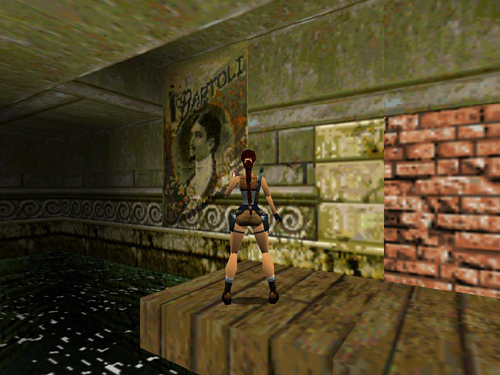 NOTES: If you didn't get the AUTOMATIC PISTOLS in Venice, this baddie will drop the guns instead of the clips. Also, after killing him, you might want to take a little detour to the dock opposite where he was patrolling. There you'll find a poster of Gianni Bartoli—famous magician/occultist and father of our villain, Marco Bartoli. (screenshot) I only discovered this my third time through the game. There's nothing else here, but it's a fun bit of Tomb Raider trivia.