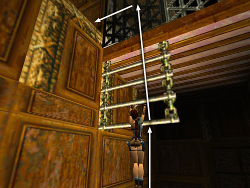 CLIMBING DOWN TO THE FLOOR: You can draw out the next group of enemies by climbing down to the lower levels in a specific spot. Start by moving to the edge of the large, square opening in the floor, near the doors where the last man and dog entered. Hang from the edge of the opening (as shown in the first of these screenshots). You'll hear a click as a door opens below and a goon with a club and 2 more dogs (16-18) enter. Traverse to the left and drop directly down to LEVEL 2. You can then shoot the man and dogs from here, and they won't be able to reach Lara.