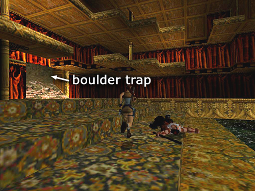 After using the left switch to open the gate, drop down into the dark room below the LIGHTING BOOTH. There's a boulder trap here. I recommend setting it off now, since you'll return here later and by then you may have forgotten about it. The boulders come out of the rough, brick opening at the top of the slope. To trigger them, run down the slope directly in front of that opening. When you reach the bottom of the slope, veer into the right corner. The boulders should then land harmlessly on the left. (These screenshots show the sequence.)