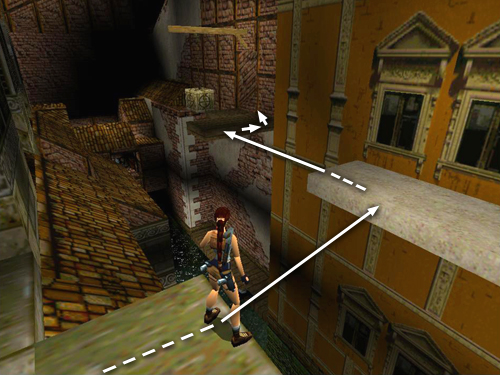 ROOFTOP WITH BREAKAWAY TILES: The remains of this decaying roof are similar to the collapsing tiles you've encountered before. It's a loooong way down, but crossing really isn't as hard as it looks, as long as you keep moving. Start by positioning Lara at the middle-right side of the ledge, facing the part of the roof that has a gap, three wood squares, another gap, three more wood squares and another gap. (screenshot). Walk to the edge, then take a standing jump forward onto the first set of wooden squares. Immediately start running. Don't pause as you cross this first wooden section. Just before the next gap, jump to land on the next wooden section ahead. Continue running and jump just before the last gap to grab the cement ledge ahead. Then pull up. Or, when running across the last wooden section, veer to the right and jump directly onto the wooden walkway below the cement ledge. (screenshot) Move to the right end of the cement ledge, and climb into the raised opening on the wall. (screenshot) Follow the passageway to where it ends overlooking the opera house roof.