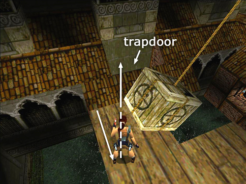 Carefully position Lara at the outer left corner of the ledge with the swinging crate on her right. It won't touch her here. (screenshot) Hop back once and then angle Lara a little to the right so she's squarely facing the open trapdoor in the roof on the other side of the canal. Use the Look button if necessary to move the camera directly behind Lara and check the angle. Now wait for the crate to swing away to the right and take a running jump past it so Lara sails across the canal into the open trapdoor.