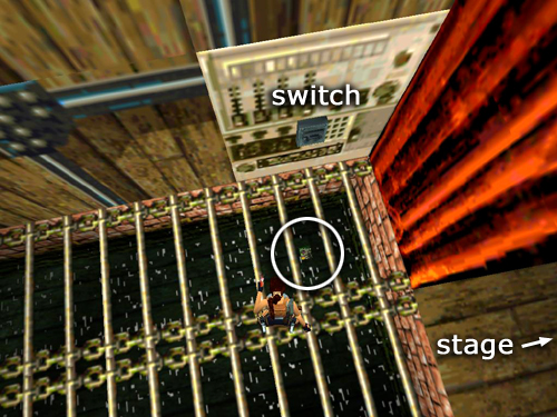 Now you'll need to time a jump past the swinging sandbag. Stand to either side of it, walk to the edge, wait for the sandbag to swing away and then jump forward past it. Avoid the second sandbag altogether by jumping to the flat area on the right of it. Then enter the passage beyond and flip the switch. This drops a sandbag on the stage which busts open the trapdoor below it. Continue past the switch and slide down the ramp, jumping just before the end to sail through the trapdoor and land in the water below. Or climb down carefully and jump in. (Again, check the screenshots if you need a visual.)