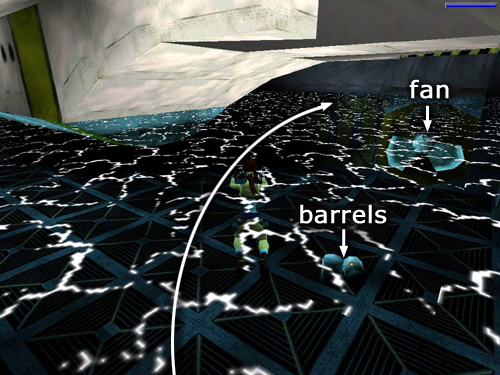 POOL AND UNDERWATER PASSAGE: As soon as Lara exits the room, an alarm begins to sound. If you linger on this ledge too long, 2 rig workers (you can't kill them yet, so they are not numbered), one with a club and one with a gun, come through the doorway on the left. To avoid them, dive into the water and swim to the other side of the pool. Just be careful not to venture too close to the huge underwater fan in the far right corner. If Lara passes the barrels on the bottom, whether she's swimming underwater or on the surface, she'll get sucked into the blades. So either swim underneath the plane or stay close to its tail as you swim along the surface. (screenshot)