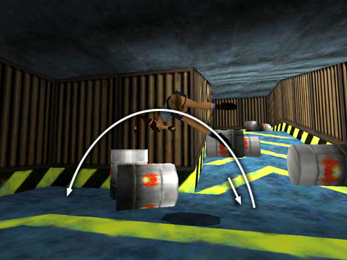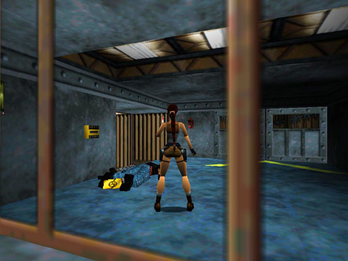 LOCKUP: You begin this level imprisoned in a room full of crates. Check your inventory. Though they've kindly left Lara her health packs, flares and ammo, the bad guys seem to have confiscated all her weapons. You'll have to get them back.