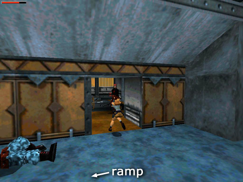 ROOM WITH RAMP AND METAL LEDGES: If you rush into the next room, Lara will be ambushed by 3 more rig workers (7-9). But if you proceed with caution, you can take them out one at a time. First, draw pistols and step into the doorway without going any farther. Lara will target the enemy on the catwalk to the left so you can shoot him without taking any damage or triggering the other enemies. Then enter the room and immediately take a running jump across the shallow pit on the left to land on the catwalk. An alarm starts blaring, but there's nothing you can do about it, so just go on about your business. Two bad guys with clubs (10-11) appear, one materializes inside the room, one comes in from the hallway. Although they can climb onto the other metal ledges in this room, they can't reach Lara here. Take your time and use pistols so you don't waste ammo. Afterward, loot the bodies for a small medi pack, flares, and shotgun shells (19-21). (screenshots)