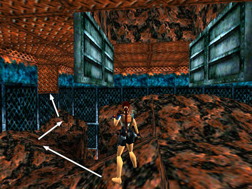 BIG ROOMS FILLED WITH DIRT: Follow the passage from the water and drop down into a big room full of reddish dirt. If you safety drop from the right side of the opening (left side when hanging), Lara will land on the dirt pile below without losing any health. (screenshot) Follow the wall around to an opening in the floor and drop down into an even bigger dirt-filled room below.