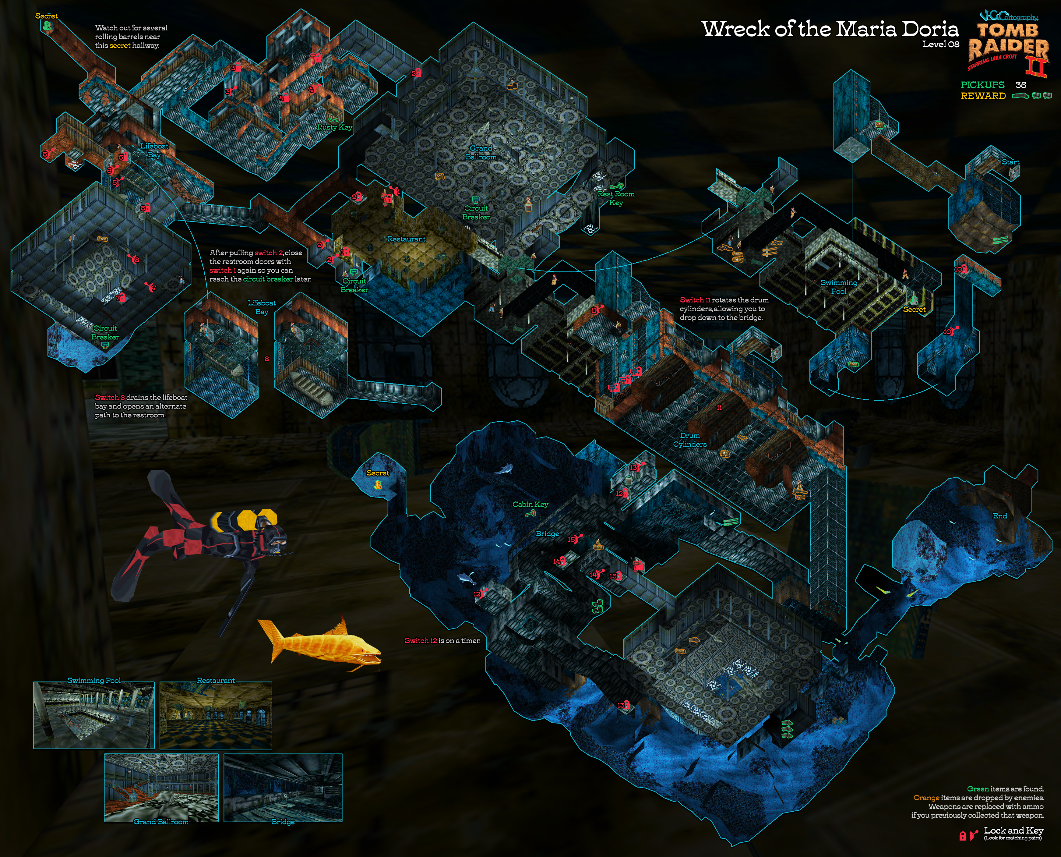 OBJECTIVES: Swim into another section of the wreck. This time you'll visit the areas where the posh, seagoing passengers spent their time. Explore this area to find 3 circuit breakers. When you have them all, return to the upside-down swimming pool, where you started, and swim through a flooded passageway to a large room, where you can use the circuit breakers to reach the ship's bridge. Here you must retrieve a key from the sea bottom and use it to access the final area in the level—a large room with an ornate, glass ceiling that now forms its floor. From there, swim through an underwater cave to the level exit.