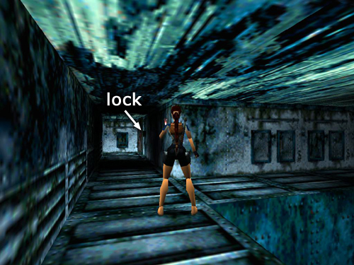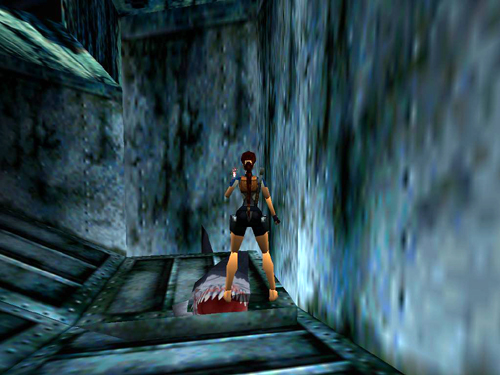NOTE: An alternate method for this area is to wait to open the trapdoor (or close it again if you've already opened it). Then, while it's still closed stand above it and use the pistols to shoot the sharks and barracudas through the closed door. It takes some time but makes for a much more relaxed swim. Just be sure not to stand on the trapdoor when sharks are directly underneath. They can bite Lara through the door! (screenshot)