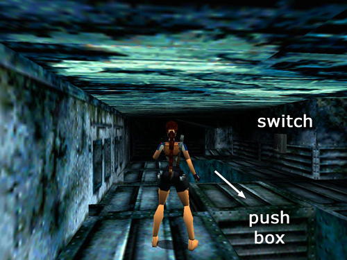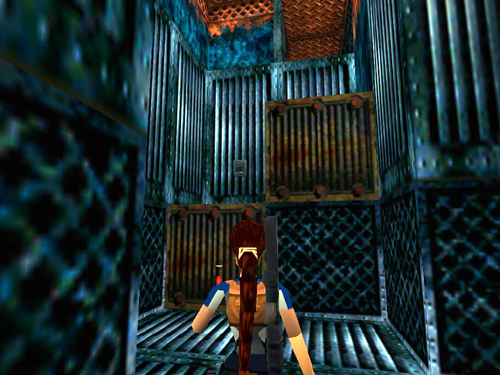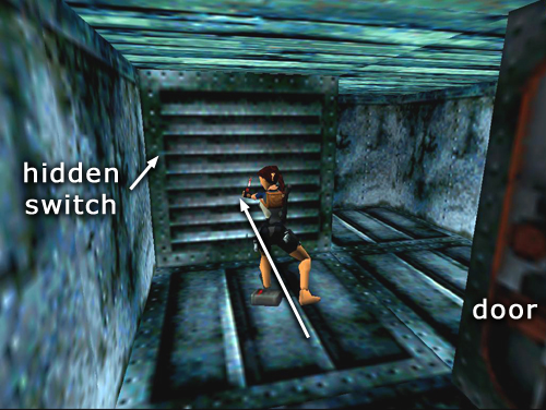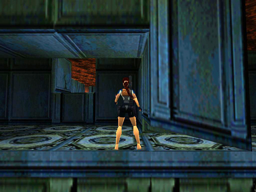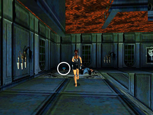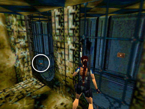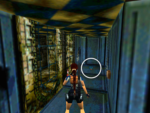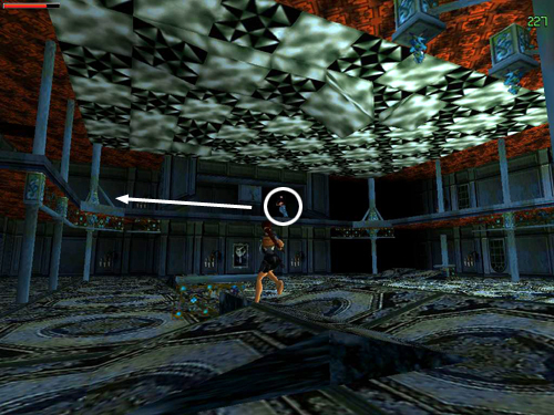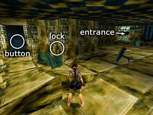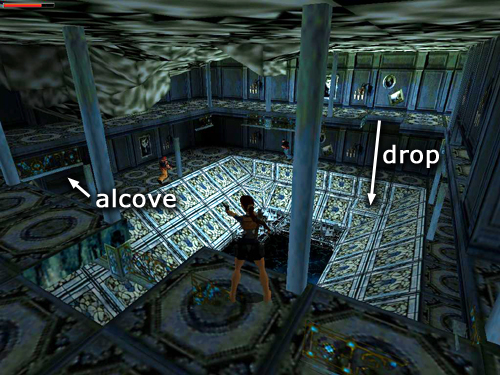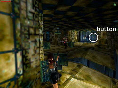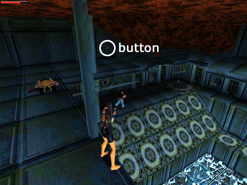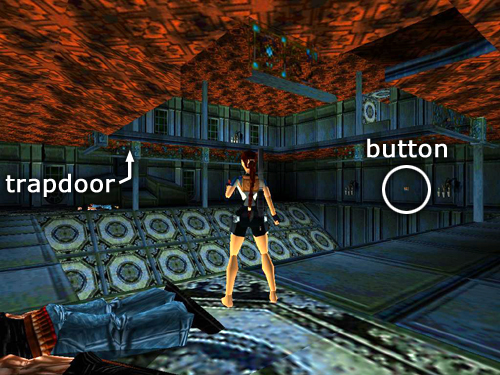 When you've taken care of the bad guys, go around to the left side of the upper level (i.e., left relative to the entrance) to the button on the wall. This button opens a timed trapdoor to the right. You can run all the way around the perimeter and take a running jump through the trapdoor before it closes. But first try this shortcut: Save the game in case this doesn't work. Then, instead of pressing the button, just stand facing it and hop back, holding Action as though you were going to drop and grab the edge. Instead of grabbing, Lara should land on the floor below.